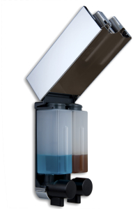 Der Verbrauch reduziert sich durch präzise Dosierung per Knopfdruck. Der Seifenspender spendet stets die richtige Menge. Kein teures Pflegemittel wird mehr vergeudet. Für sparsamen, umweltfreundlichen Gebrauch sorgen die patentierten Pumpen des Seifenspenders. Kleine Sichtfenster zeigen an, wenn der Inhalt zur Neige geht. Der Seifenspender eignet sich für flüssige Seife, Duschgels, Shampoo, Lotion, Schaumbad, Babyöl etc.